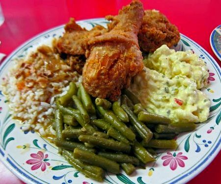 The classic southern plate for supper consists of meat and three, cornbread or rolls a tall glass of sweet iced tea.