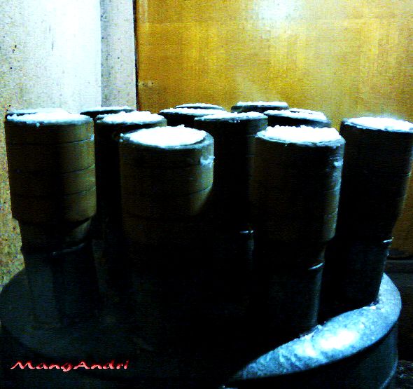 Layer the puttu kutty (round tube) first after some grated coconut, adding 2 fistful of puttu flour.On the other hand add grated coconut adopted by puttu flour.Repeat exactly the same process before the mould/puttu kutty is full ending it with grated coconut.(see picture above)
